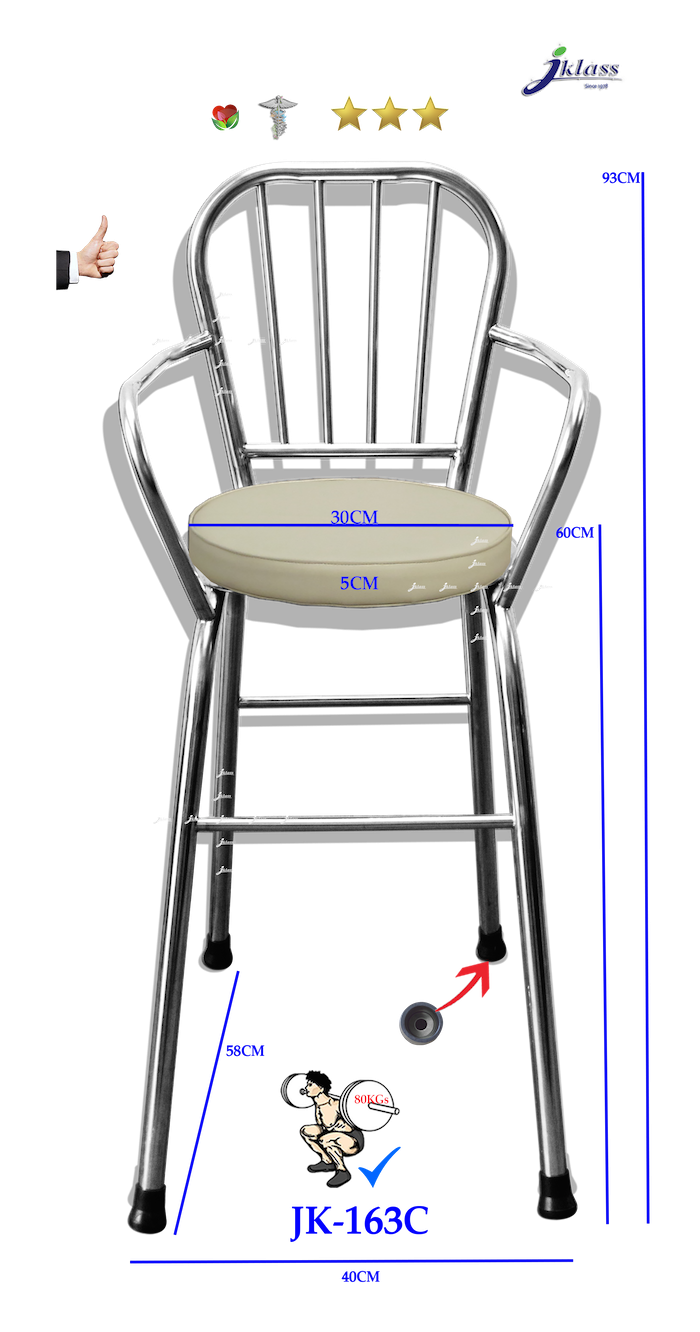 ขนาดรวมกว้าง ๔๐ ซม.ลึก ๕๘ ซม.ที่นั่งสูง ๖๐ ซม.พนักพิงสูง ๙๓ ซม.